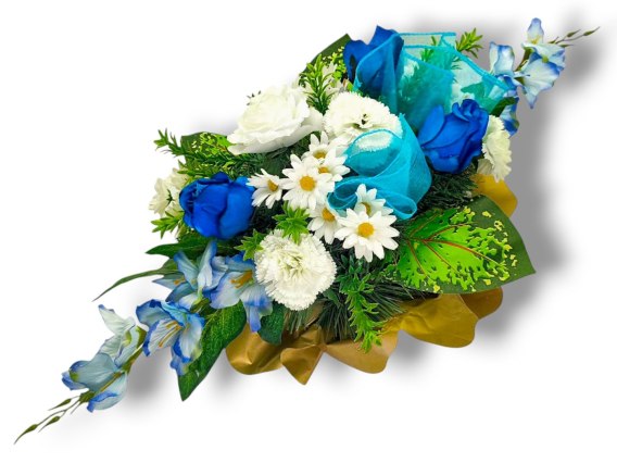 BIAŁO NIEBIESKI STROIK NA CMENTARZ KWIATY NA GRÓB POMNIK + OBCIĄŻENIE