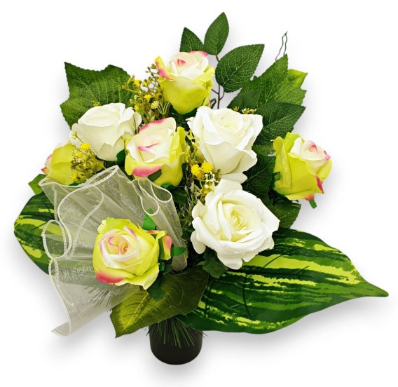 Kompozycje nagrobne z obciążeniem z wysokiej jakości sztucznych kwiatów i roślin.
