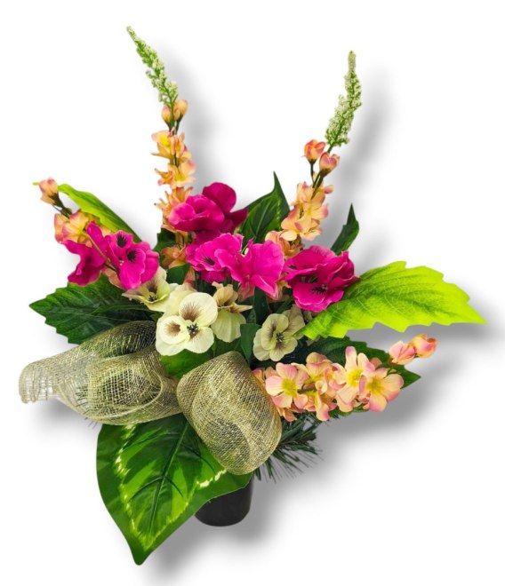 Kompozycje nagrobne z obciążeniem z wysokiej jakości sztucznych kwiatów i roślin.