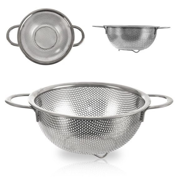 Uniwersalne sitko kuchenne w formie miski. Wykonane ze stali nierdzewnej. Posiada dwa uchwyty oraz nóżki, które zapewnią stabilizację. Sprawdzi się do odcedzania, mycia i płukania produktów.