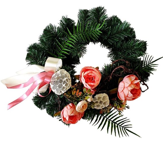3. Realistyczne i naturalne kwiaty: Nasz wieniec zawiera unikalną kompozycję kwiatów, które wyglądają naturalnie i realistycznie, dodając autentyczności.