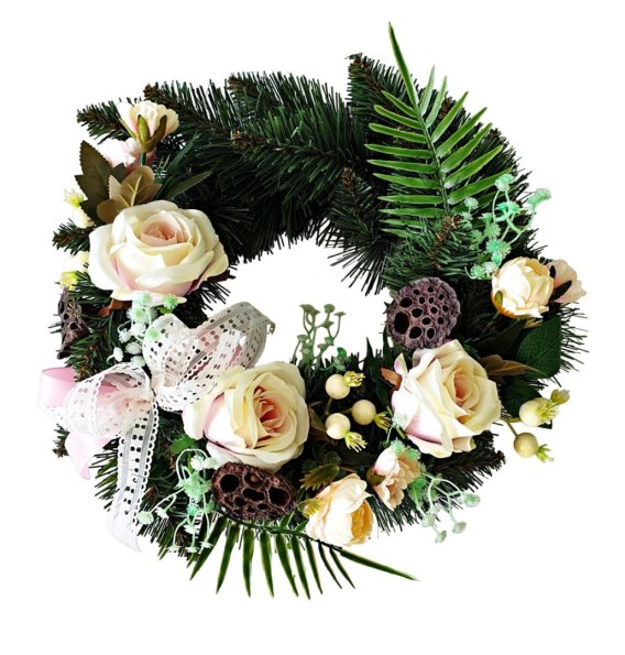 3. Realistyczne i naturalne kwiaty: Nasz wieniec zawiera unikalną kompozycję kwiatów, które wyglądają naturalnie i realistycznie, dodając autentyczności.