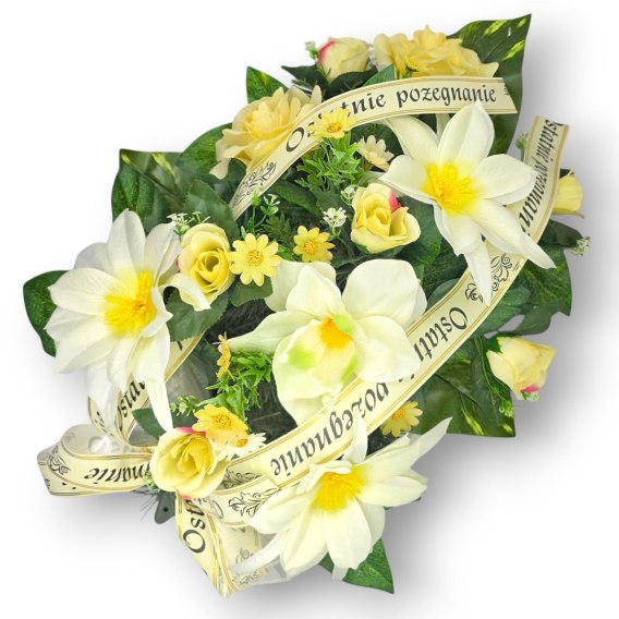 Wiązankę cechuje gęsty splot sztucznych gałązek iglastych, które tworzą estetycznie wyglądające tło dla unikalnej kompozycji sztucznych kwiatów. Starannie dobrane kwiaty są niezwykle realistyczne i naturalne, dodając wiązance autentyczności i podkreślając jej uroczysty charakter.