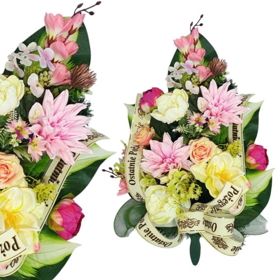 Kwiaty są integralnym elementem ceremonii ostatniego pożegnania lub jako element ozdobienia grobu, łącząc szacunek i elegancję w jednym, starannie wykonanym projekcie. Podkład wieńca jest wykonany z zielonych, gęsto splecionych gałązek PCV, które są zarówno trwałe, jak i estetyczne, podkreślając kolorystykę wiązanki.