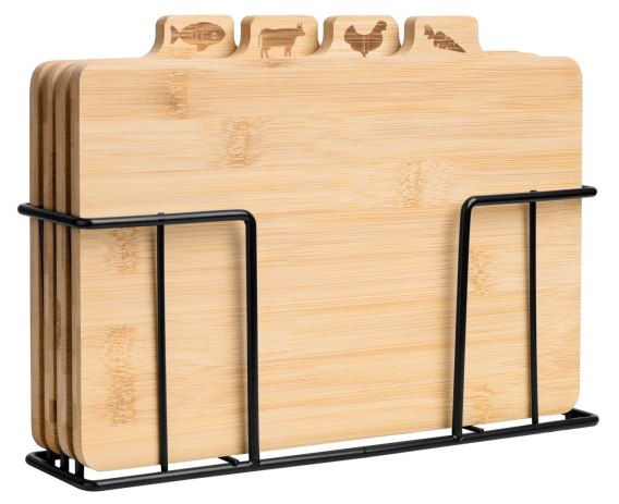 Skara to praktyczny i elegancki zestaw desek bambusowych osadzonych na stalowym stojaku malowanym proszkowo na czarny kolor. Każda z desek ma swoje określone przeznaczenie. Deski służą do warzyw, drobiu, mięsa i ryb. Dzięki umieszczonym oznaczeniom będziesz mieć pewność, że używasz dedykowanej, prawidłowej deski. Komplet zajmuje mało miejsca, a każdą z desek będziesz mieć zawsze pod ręką. Zestaw zapewnia odpowiednią higienę przygotowywanych potraw. Deski wykonane są z naturalnego drewna bambusowego, dzięki czemu są odporne na wilgoć i odkształcenia, nie chłoną zapachów i szybko schną. Drewno bambusowe jest naturalnym materiałem ekologicznym, bezpiecznym dla zdrowia.