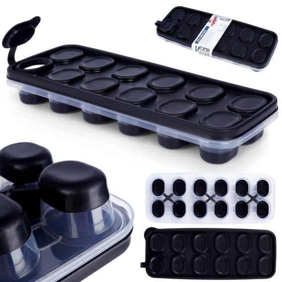 Forma na 12 kostek lodu z wygodną pokrywką i silikonowym dnem. Pokrywka zapobiegnie wylewaniu wody a silikon ułatwi wyciąganie kostek. Dodatkowo otwór na wlewanie wody.