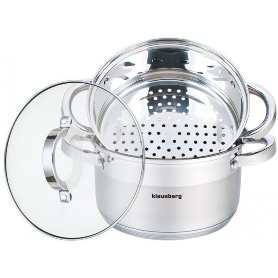 3 częściowy komplet garnków do gotowania na parze KLAUSBERG bazujący na garnku 4.0L / Ø22cm. Zestaw wykonany z wysokiej jakości stali nierdzewnej. Wykorzystana stal składa się z najlepszej jakości stopu powszechnie stosowanego w światowej klasy produktach, co gwarantuje jej wysoką odporność na korozję oraz bardzo dobrą wytrzymałość. Zastosowany materiał umożliwia szybkie podgrzanie potraw i przez dłuższy czas utrzymuje ciepło.
