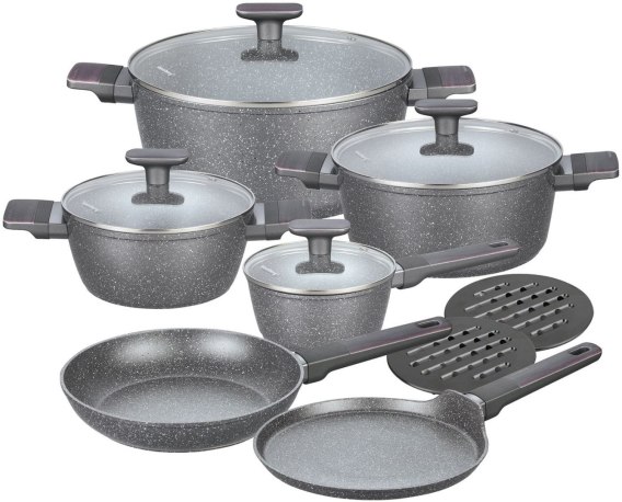 12-elementowy zestaw garnków i patelni z marmurkową powłoką nieprzywierającą marki KLAUSBERG. W zestawie znajdują się naczynia o zróżnicowanych rozmiarach, dzięki temu ten komplet świetnie sprawdzi się do codziennego użytku w każdym gospodarstwie domowym.