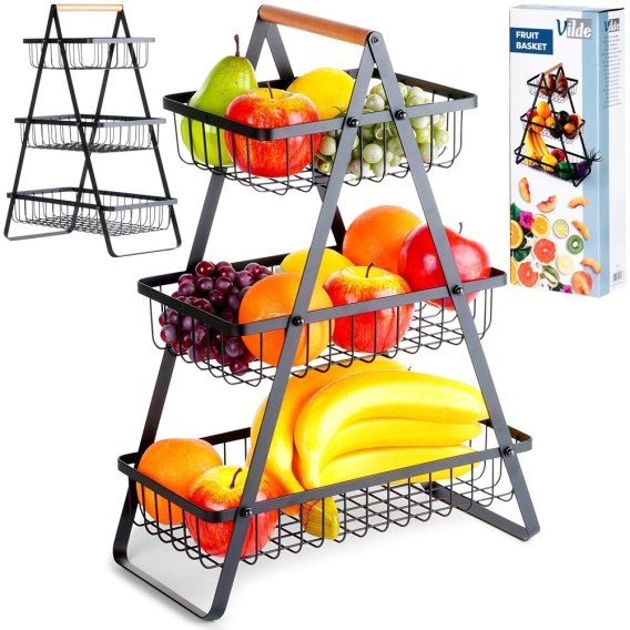 Trzypoziomowy dla lepszej organizacji - Koszyk posiada trzy poziomy, dzięki czemu ma dużą pojemność. Dodatkowo, posiada otwarte ścianki, które zapewniają odpowiednią cyrkulację powietrza. Dzięki niemu owoce lub warzywa będą pięknie wyeksponowane, a także dłużej zachowają świeżość.