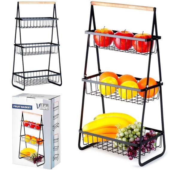 Praktyczny, trzypoziomowy koszyk na owoce i warzywa. Wykonany z wytrzymałych materiałów. Koszyk jest wielofunkcyjny i może być również wykorzystywany do przechowywania drobnych produktów codziennego użytku czy artykułów biurowych. Jest stabilny, praktyczny i poręczny, wyposażony w wygodny uchwyt, który ułatwi przenoszenie. Koszyk na owoce utrzymany w modnym stylu, więc efektownie prezentuje się w każdym wnętrzu. Idealny do każdej kuchni oraz jadalni. Oryginalny produkt marki Vilde. Wyprodukowano zgodnie z europejskimi standardami.