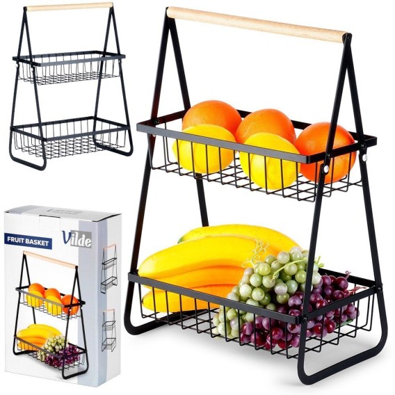 Praktyczny, dwupoziomowy koszyk na owoce i warzywa. Wykonany z wytrzymałych materiałów. Koszyk jest wielofunkcyjny i może być również wykorzystywany do przechowywania drobnych produktów codziennego użytku czy artykułów biurowych. Jest stabilny, praktyczny i poręczny, wyposażony w wygodny uchwyt, który ułatwi przenoszenie. Koszyk na owoce utrzymany w modnym stylu, więc efektownie prezentuje się w każdym wnętrzu. Idealny do każdej kuchni oraz jadalni. Oryginalny produkt marki Vilde. Wyprodukowano zgodnie z europejskimi standardami.