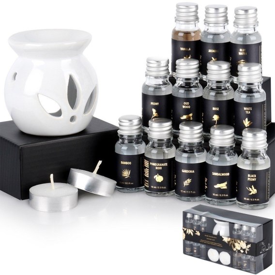 Zestaw z kominkiem zapachowym i 12 olejkami - Zestaw zawiera elegancki kominek zapachowy o wymiarach 7 x 7,5 cm, 12 olejków zapachowych o pojemności 10 ml: czarna piwonia, owoce granatu, bambus, drzewny, wanilia, biała herbata, róża, piwonia, drzewo sandałowe, gardenia, jaśmin oraz niebieska woda. W zestawie również dwie świeczki typu tealight.