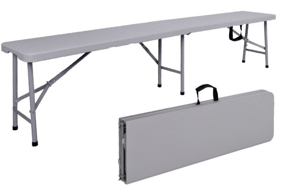 Składana ławka cateringowa jest bardzo praktyczna oraz wytrzymała. Konstrukcja wykonana ze stali malowanej proszkowo. Siedzisko wykonane z polietylenu HDPE. Wzorowane na rattan. Odporna na promienie słoneczne. Dzięki unikalnemu projektowi całość konstrukcji chowa się w siedzisko ławki, zajmując mało miejsca i tworząc ergonomiczną walizkę, łatwą do przenoszenia.