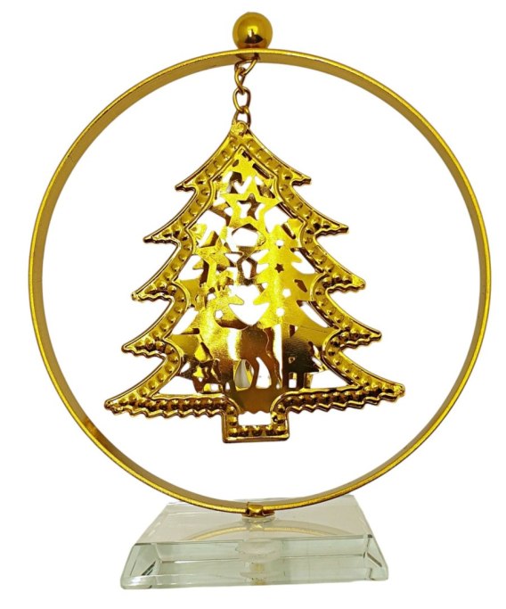 Wprowadź magiczny, świąteczny nastrój do swojego wnętrza z elegancką metalową dekoracją w kształcie wiszącej choinki w okrągłej ramie. Dekoracja wykonana jest z metalu o złotej kolorystyce, co nadaje jej luksusowy i elegancki wygląd. W zestawie znajduje się okrągła rama, na której zawieszona jest delikatna choinka z misternymi, ażurowymi detalami, w tym z motywem renifera.