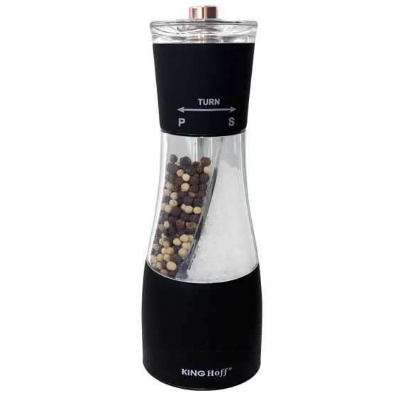 Młynek do pieprzu i soli 2 w 1 KINGHOFF DUET dwukomorowy, przeznaczony do ręcznego mielenia pieprzu, soli oraz innych suszonych przypraw. Jeśli lubisz gotować i zawsze używasz do tego świeżo mielonych przypraw, to młynek KINGHOFF DUET jest produktem idealnym dla Ciebie. Wyobraź sobie jak pyszne będą Twoje potrawy, kiedy przyprawisz je świeżo zmielonym, pachnącym pieprzem i solą. Korzystanie z urządzenia ułatwi Ci regulacja grubości mielenia, dzięki której możesz dostosować stopień zmielenia przypraw do własnych potrzeb. Zaletą młynka jest jego podwójna komora, dzięki czemu w jednym młynku możemy wsypać pieprz oraz sól. W ten sposób zaoszczędzisz miejsce w kuchni. Obrót górnej części obudowy w lewo przeznaczony jest dla pieprzu, a w lewo dla soli. Cechy: • Dwa w jednym: Dzięki temu młynkowi możesz mielić zarówno sól, jak i pieprz jednocześnie. Wielofunkcyjność w jednym narzędziu.