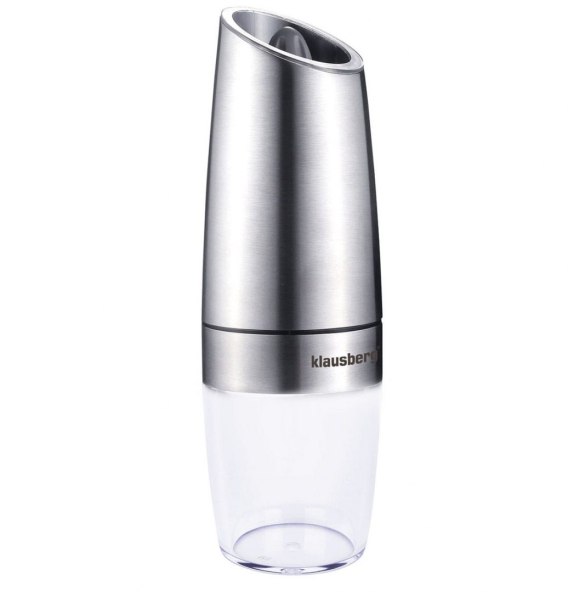 Grawitacyjny młynek elektryczny do soli lub pieprzu firmy KLAUSBERG. Bardzo łatwy w użyciu! Wystarczy przekręcić młynek do góry nogami i automatycznie zacznie pracę, odchylić i przestanie mielić. Wykonany z solidnego metalu w kolorze srebrnym. Obudowa z okienkiem wskazującym poziom zawartości ziaren. Wydajny silnik który bez trudu radzi siebie z każdym rodzajem pieprzu lub soli. Odporny na korozję ceramiczny mechanizm do ścierania z regulacją grubości mielenia. Wyposażony w podświetlenie LED które włącza się automatycznie po przechyleniu młynka.