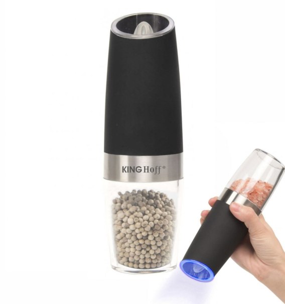 Grawitacyjny młynek elektryczny do soli lub pieprzu firmy KINGHOFF. Bardzo łatwy w użyciu! Wystarczy przekręcić młynek do góry nogami i automatycznie zacznie pracę, odchylić i przestanie mielić. Wykonany z antypoślizgowego tworzywa sztucznego w matowym kolorze czarnym. Obudowa z okienkiem wskazującym poziom zawartości ziaren. Wydajny silnik który bez trudu radzi siebie z każdym rodzajem pieprzu lub soli. Odporny na korozję ceramiczny mechanizm do ścierania z regulacją grubości mielenia. Wyposażony w podświetlenie LED które włącza się automatycznie po przechyleniu młynka.