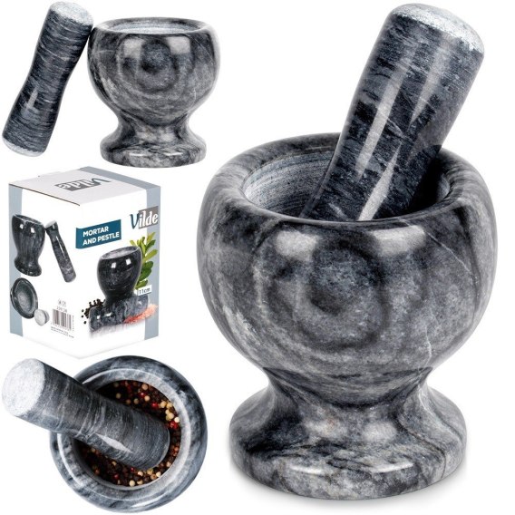 Moździerz z tłuczkiem wykonany z najwyższej jakości materiałów. Wyjątkowo przydatny w kuchni podczas ucierania przypraw, nasion, ziół i orzechów. Dzięki swojej solidnej konstrukcji będzie niezbędnym narzędziem w Twojej kuchni. Moździerz wykonany jest z naturalnego granitu, poszczególne egzemplarze mogą się od siebie różnić strukturą i ubarwieniem. Oryginalny produkt marki Vilde. Wyprodukowano zgodnie z europejskimi standardami.