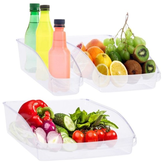 Zestaw trzech organizerów do lodówki. Praktyczne pojemniki w trzech rozmiarach pomogą uporządkować przestrzeń w naszej lodówce. Pojemniki mają przezroczysty kolor.