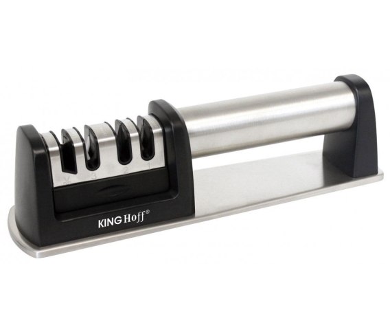 3 etapowa, 4 szczelinowa ostrzałka do noży i nożyczekfirmy KINGHOFF przeznaczona dla każdego rodzaju noży, od kuchennych do myśliwskich i wojskowych. Wyposażona w antypoślizgową podstawę celem zachowania stabilizacji podczas ostrzenia. Grubszy element ostrzący poprzez zestrojenie konta ostrzenia przeznaczony jest do szybkiego wyprowadzenia idealnego kąta ostrza. Pośredni element wygładza krawędzie, cieńszy natomiast służy do końcowego wypolerowania ostrzonej krawędzi. W tej szczelinie możemy również ostrzyć noże ceramiczne. Czwarta szczelina przeznaczona jest do ostrzenia nożyczek.