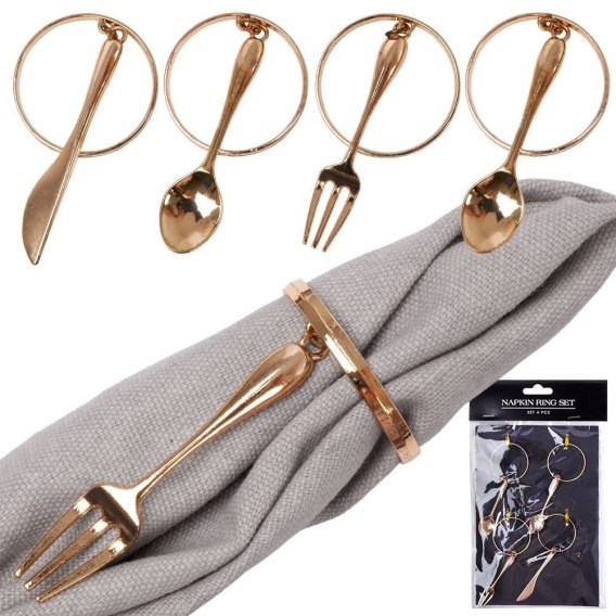Zestaw 4 szt. obrączek na serwetki o średnicy 4 cm. Wykonane z wysokiej jakości metalu w kolorze złotym, zaczepione są na nich efektowne sztućce.