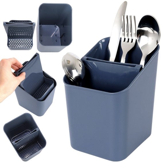 Pojemnik z 2 przegródkami, wykonany z wysokiej jakości tworzywa w kolorze szarym. Świetnie sprawdzi się do ociekania oraz przechowywania sztućców, przyborów kuchennych.