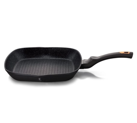 Patelnia grillowa granitowa Ø28cm BERLINGER HAUS z serii BLACK ROSE COLLECTION Garnki i akcesoria z serii BLACK ROSE firmy BERLINGER HAUS wykonane są z wysokiej klasy kutego aluminium pokrytego wewnątrz potrójną powłoką granitową (marble) o bardzo wysokim współczynniku twardości. Powłoka zewnętrzna występuje w kilku wersjach kolorystycznych o charakterystycznym metalicznym połysku. Te atrakcyjne i modne naczynia wyposażone są standardowo w uchwyty typu SOFT TOUCH (silikon handle). Przystosowane do wszystkich rodzajów kuchenek: gazowa, elektryczna, ceramiczna, halogenowa, indukcyjna. System TURBO INDUCTION (bardzo szybko nagrzewają się) pozwala zaoszczędzić nawet 35% energii.