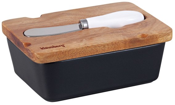 Porcelanowa maselniczka od marki KLAUSBERG w kolorze czarnym z pokrywą wykonaną z drewna akacjowego.