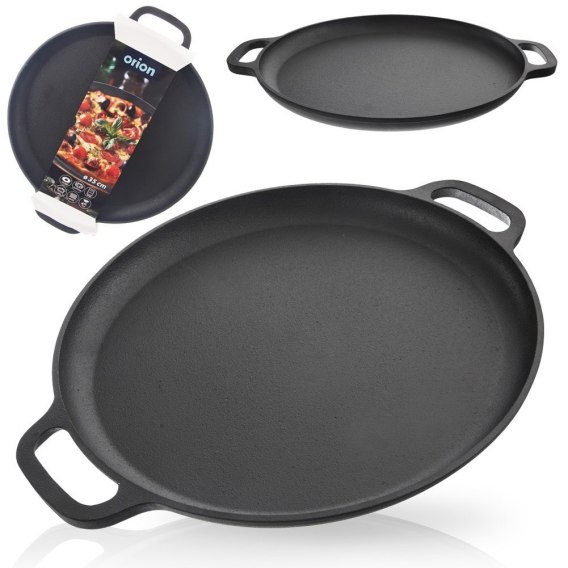 Okrągła patelnia żeliwna idealna do przygotowywania różnego rodzaju potraw. Wyposażona w wygodne uchwyty. Patelnia zapewnia szybkie i jednolite smażenie. Możemy użytkować ją w każdej kuchence, ale również bezpośrednio na grillu, czy ogniu. Patelnia jest niezwykle solidna i ciężka. Żeliwo rozgrzewa się równomiernie i długo utrzymuje ciepło, dzięki czemu serwowane dania dłużej będą ciepłe. Oryginalny produkt czeskiej marki Orion. Wyprodukowano zgodnie z europejskimi standardami.