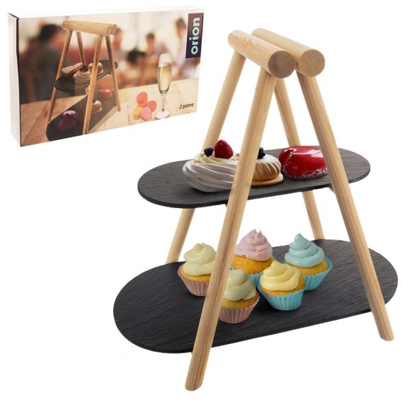 Piętrowa patera na wędlinę, sery, ciastka, owoce, przystawki, przekąski. Posiada 2 poziomy składające się z tac wykonanych z kamienia łupkowego, drewniana konstrukcja.