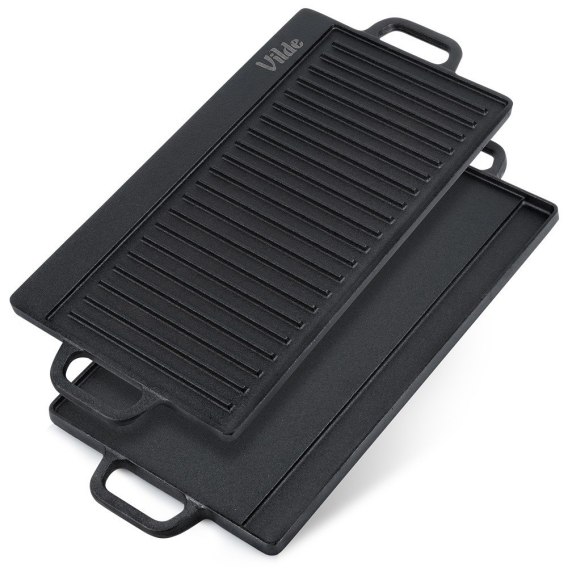 Dwustronna płyta żeliwna do grillowania mięs, ryb, warzyw. Posiada dwie powierzchnie grillowe przydatne do różnego rodzaju potraw. Płyta jest wytrzymała i odporna. Żeliwo z którego została wykonana jest wysokiej jakości gwarantuje długotrwałą wydajność i odporność na codzienne użytkowanie. Oryginalny produkt marki Vilde. Wyprodukowano zgodnie z europejskimi standardami.