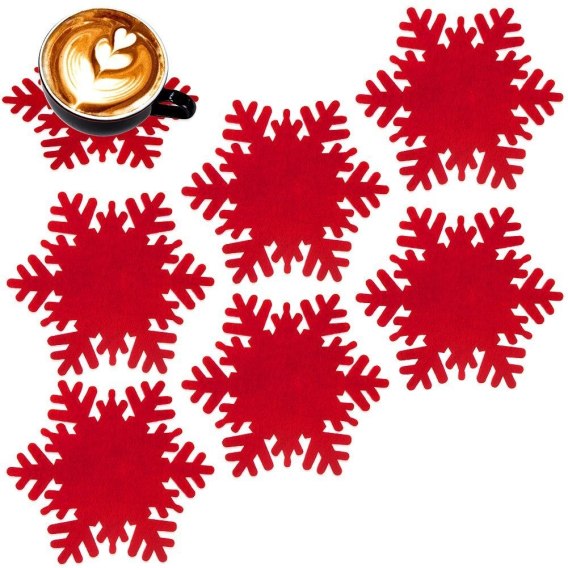 PRZYDATNE - Zestaw sześciu podkładek pod gorące kubki, szklanki oraz filiżanki w kształcie płatków śniegu. Każda podkładka ma wymiary 13,5 x 13 cm. Stanowią wyjątkową dekorację i ozdobę stołu.