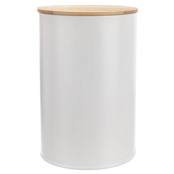 Metalowy pojemnik w kolorze białym do przechowywania różnych produktów spożywczych. Posiada pokrywkę wykonaną z drewna bambusowego wyposażoną w silikonową uszczelkę.