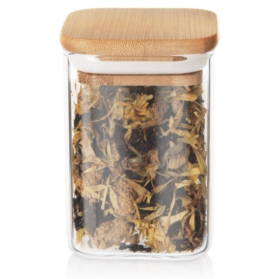 Pojemnik ze szkła borokrzemowego z pokrywką z drewna bambusowego. Szczelny dzięki silikonowej uszczelce, kwadratowy kształt.