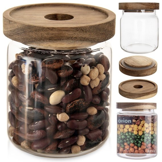 Pojemnik do przechowywania żywności z drewnianą pokrywą posiadającą uszczelkę. Nadaje się do przechowywania różnych produktów spożywczych. Znajdzie wiele zastosowań w kuchni. Dzięki szczelnej zakrętce z silikonową uszczelką przechowywane produkty utrzymają dłużej świeżość. Przezroczyste szkło pozwoli nam w łatwy sposób sprawdzić zawartość pojemnika i w efektowny sposób wyeksponować ją. Przechowywanie produktów w pojemniku pozwoli na uporządkowanie przestrzeni kuchennej. Oryginalny produkt czeskiej marki Orion. Wyprodukowano zgodnie z europejskimi standardami.