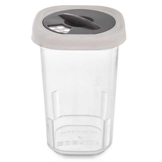 Pojemnik na przyprawy z dozownikiem. Wykonany z przezroczystego tworzywa. Posiada trzy stopnie regulacji dozowania. Nadaje się do zmywarki.