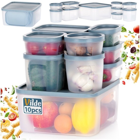 Zestaw 10 pojemników kuchennych w 8 różnych rozmiarach. Idealne do przechowywania żywności oraz produktów sypkich. Nadają się do zmywarki, lodówki, zamrażarki.