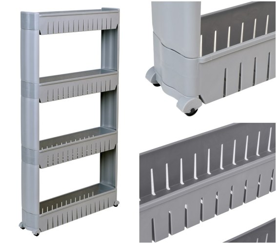 Mobilna szafka idealna do wąskich przestrzeni, takich jak kuchnia czy łazienka. Jej modułowa konstrukcja wykonana z wytrzymałego tworzywa umożliwia łatwe dopasowanie do potrzeb - półki można dodawać lub odejmować. Dzięki kompaktowym wymiarom doskonale sprawdzi się między szafką a lodówką, pralką czy w innych trudno dostępnych miejscach. Regał kuchenny świetnie nadaje się do przechowywania przypraw, akcesoriów kuchennych, kosmetyków, środków czystości i wielu innych niezbędnych rzeczy. Mobilność zapewniają cztery kółka, dzięki którym szafka łazienkowa na kółkach łatwo przemieszcza się tam, gdzie jest potrzebna.