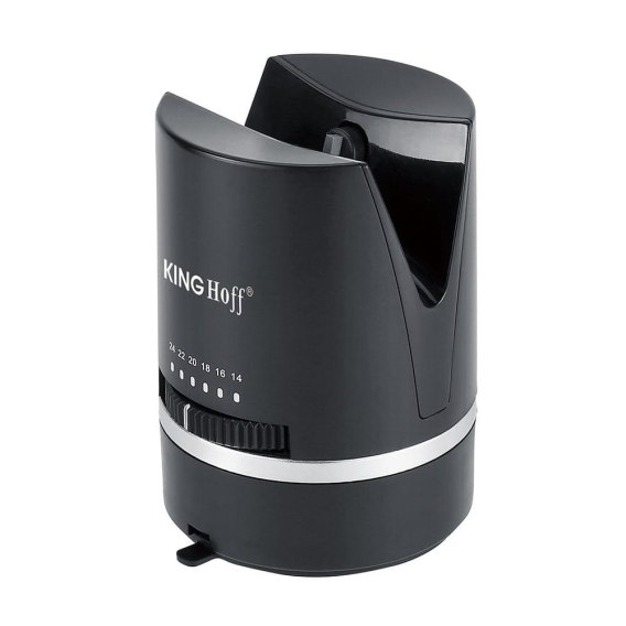 Kompaktowa, innowacyjna ostrzałka do noży z regulacją kąta ostrzenia 14°-24° (6 stopni) firmy KINGHOFF. Ostrzałka łączy dwie powierzchnie o różnej gradacji z regulowanymi kątami ostrzenia, umożliwiając szybkie wyprowadzenie idealnie gładkich krawędzi tnących.