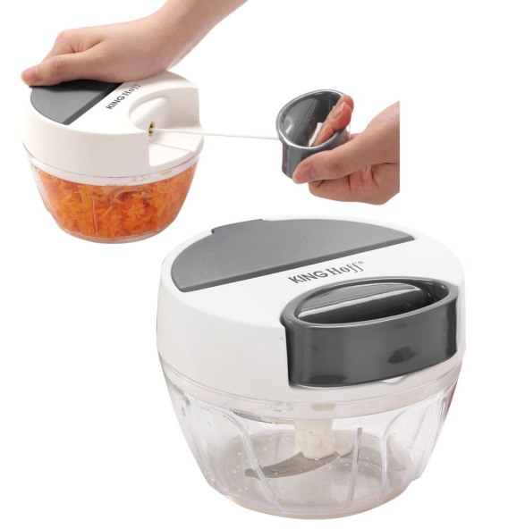 Rozdrabniacz kuchenny KINGHOFF to niezastąpione narzędzie do szybkiego i skutecznego siekania owoców, warzyw, ziół i innych składników. Mechaniczne napędzanie przez pociągnięcie linki pozwala na wydajne rozdrabnianie bez potrzeby użycia prądu. Produkt doskonały do codziennego użytku w kuchni, zapewnia równomierne siekanie w zaledwie kilka sekund.
