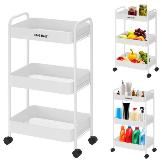Elegancki, praktyczny i niezwykle funkcjonalny — trzypoziomowy regał mobilnymarki KINGHoff to doskonałe rozwiązanie do kuchni, łazienki, salonu lub biura. Dzięki solidnej stalowej konstrukcji i nowoczesnemu czarnemu wykończeniu idealnie wpasuje się w każde wnętrze, zapewniając wygodne miejsce do przechowywania i łatwy dostęp do niezbędnych przedmiotów.