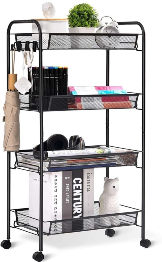 Olden to wielozadaniowy regał, który sprawdzi się w każdych warunkach. Idealny do kuchni, łazienki, salonu czy sypialni. Jego przemyślana konstrukcja pozwala zagospodarować wąskie przestrzenie i ułatwia dostęp do najpotrzebniejszych rzeczy. Model wyposażony w 4 półki, które z pewnością pomieszczą mnóstwo niezbędnych akcesoriów. Regał ma 4 kółka, w tym 2 posiadające blokadę z hamulcem. W zestawie 4 haczyki do zawieszania np. ścierek kuchennych. Można je montować po lewej i po prawej stronie na każdym poziomie wg uznania. Olden wykonany jest z materiałów najwyższej jakości. Konstrukcja ze stali malowanej proszkowo na czarny błyszczący kolor.