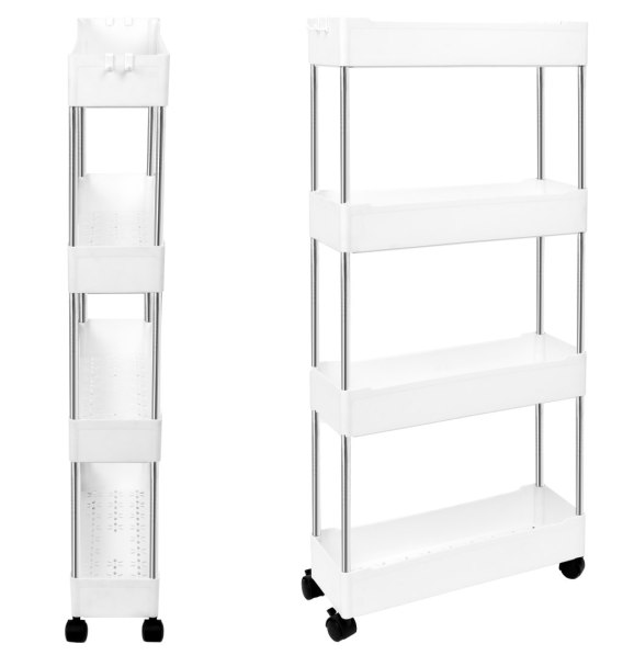 Półki zostały zaprojektowane tak, by wykorzystać wąskie przestrzenie np. między lodówką a szafką lub pralką a szafką. Posiadają 4 głębokie poziomy, które pozwolą pomieścić wiele rzeczy np. akcesoria kuchenne, butelki, przyprawy. Doskonale sprawdzą się również jako regał łazienkowy na kosmetyki, papier, płyny lub proszki. Zastosowanie 4 kółek pozwoli w łatwy i szybki sposób przesuwać konstrukcję.