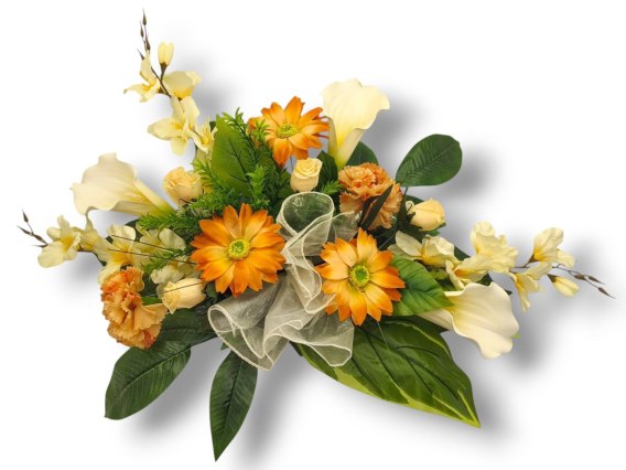 Kompozycje nagrobne z wysokiej jakości sztucznych kwiatów i roślin.