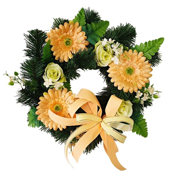 Nasz wieniec pogrzebowy cechuje się wyjątkowo gęstym splotem sztucznych gałązek iglastych, które tworzą estetycznie wyglądające tło dla unikalnej kompozycji kwiatów. Starannie dobrane kwiaty są niezwykle realistyczne i naturalne, dodając wiązance autentyczności i podkreślając jej uroczysty charakter.