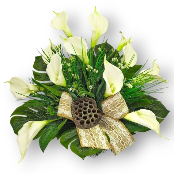 Kompozycje nagrobne z obciążeniem z wysokiej jakości sztucznych kwiatów i roślin.