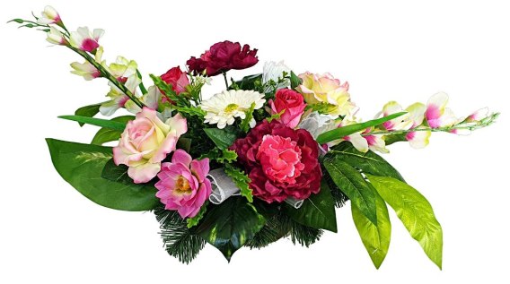 Kompozycje nagrobne z obciążeniem z wysokiej jakości sztucznych kwiatów i roślin.