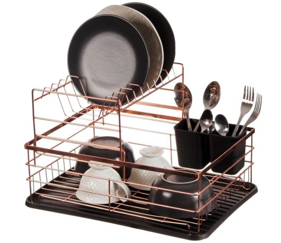 - Kolor: Różowe złoto. - Tacka z tworzywa sztucznego zabezpieczająca przed zamoczeniem blatu. - Plastikowy, zdejmowany, dwukomorowy ociekacz na sztućce. - Wymiary: 41 x 32 x 15.5 / 27.5 cm (Długość x Szerokość x Wysokość/Wysokość z nadstawką)