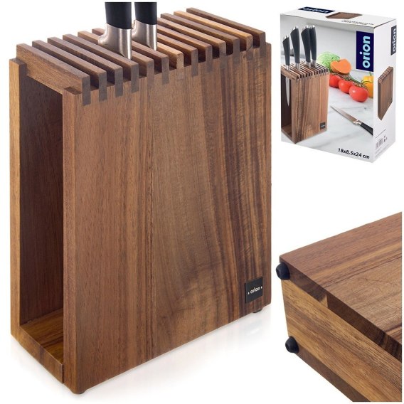 Stojak na noże wykonany z naturalnego drewna. Niezwykle efektowny będzie ozdobą każdej kuchni, jednocześnie umożliwiając odpowiednie przechowywanie dużej ilości noży. Posiada nowoczesny design, dzięki czemu będzie pasował do kuchni w stylu nowoczesnym, ale również w stylu klasycznym. Oryginalny produkt czeskiej marki Orion. Wyprodukowano zgodnie z europejskimi standardami.