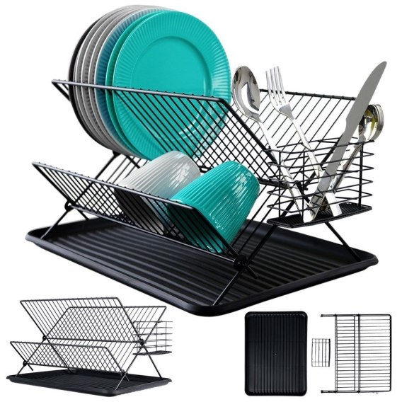 Elegancka suszarka do naczyń w kolorze czarnym. Posiada miejsce na talerze, szklanki oraz sztućce. Wyposażona w tacę ociekową.